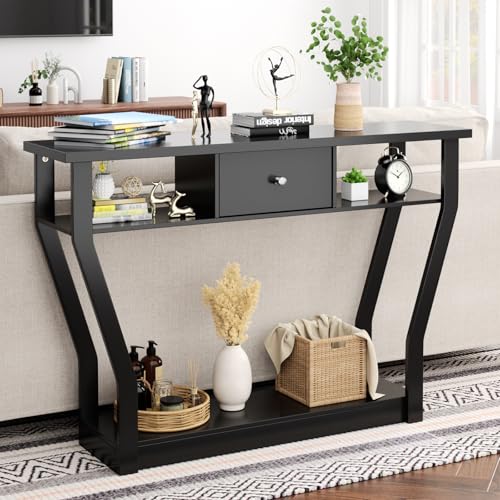 The BestComfort 47'' Narrow Console Table features an innovative three-tier design that not only enhances its functionality but also allows users to organize their belongings efficiently. The open shelves are perfect for showcasing decorative items, while the drawer provides concealed storage for smaller essentials, making it a practical choice for entryways or living rooms.