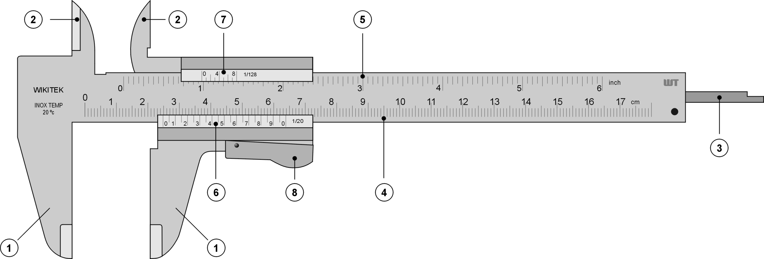 - Vernier scale:The sliding scale that gives precise readings.